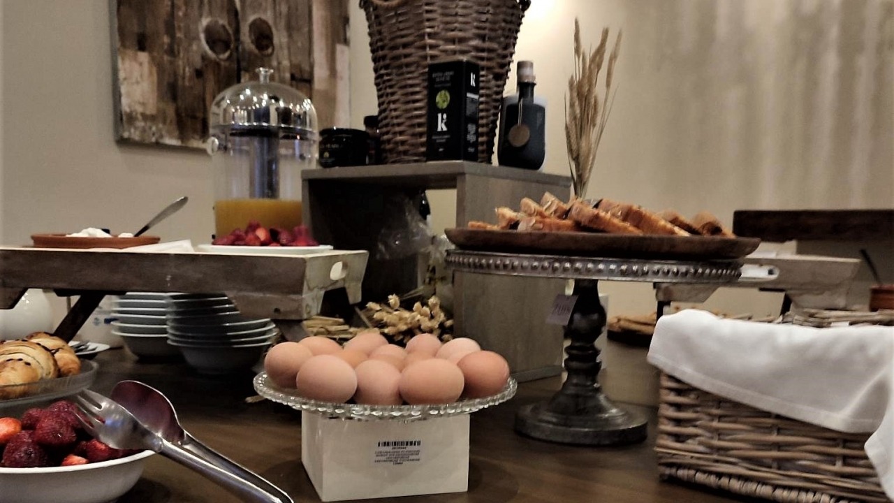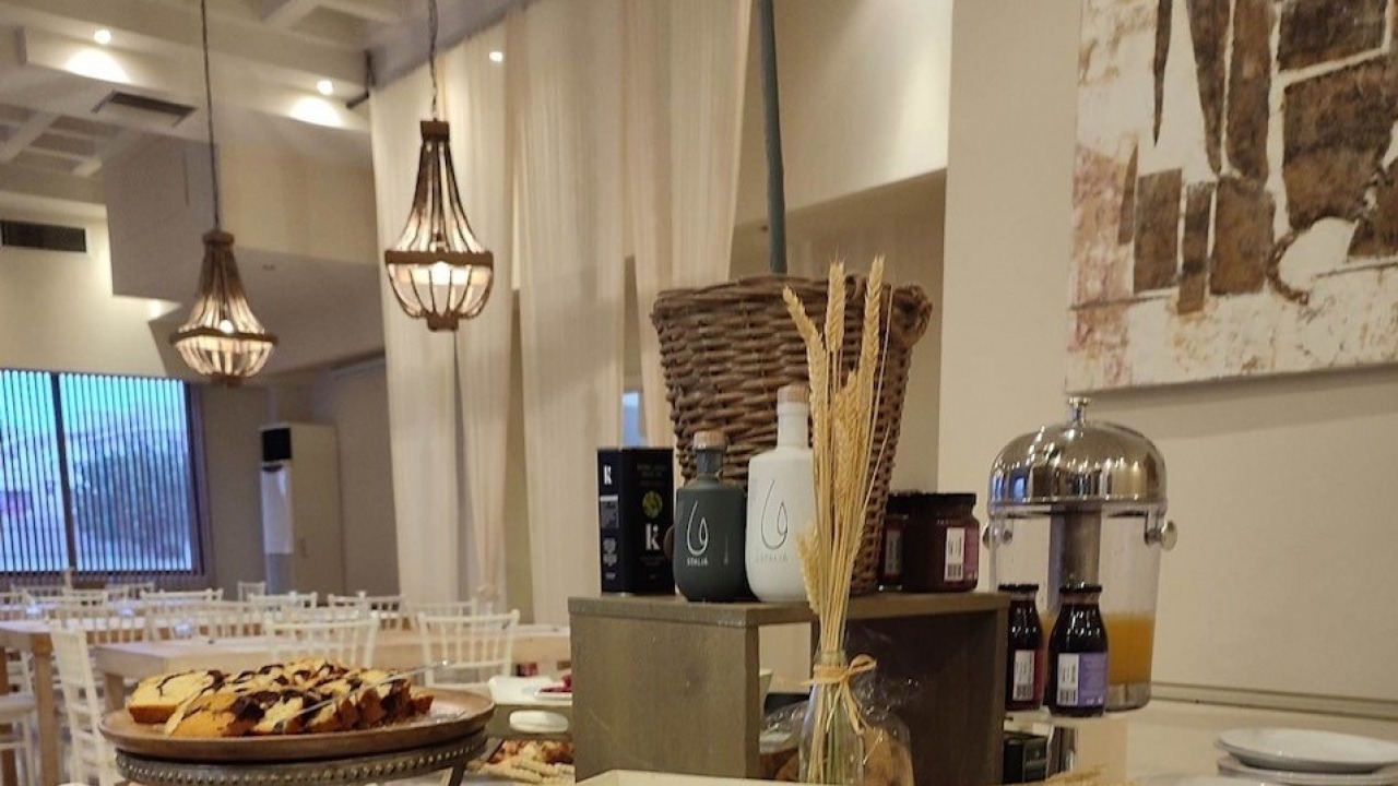 • Λαλάγγια, χωριάτικο ψωμί, κριτσίνια με σουσάμι, ντομάτα-αγγούρι, ελιές και λάδι Καλαμών, παξιμάδι με φρέσκια τριφτή ντομάτα και νιφάδες απο ντόπια σφέλα, αυγά παραγωγής μας βραστά, τηγανιτά και ομελέτα, σύγκλινο, φέτα, γραβιέρα, τυρί ένταμ και ζαμπόν σε φέτες, σπανακόπιτα και τυρόπιτα χειροποίητη.