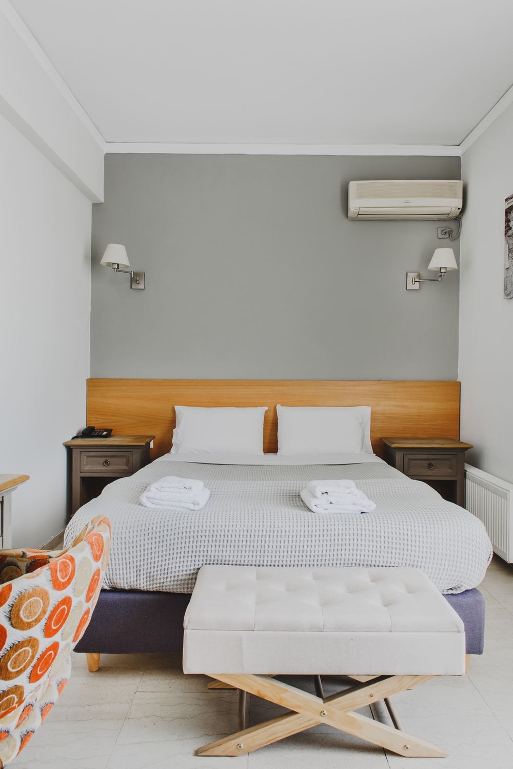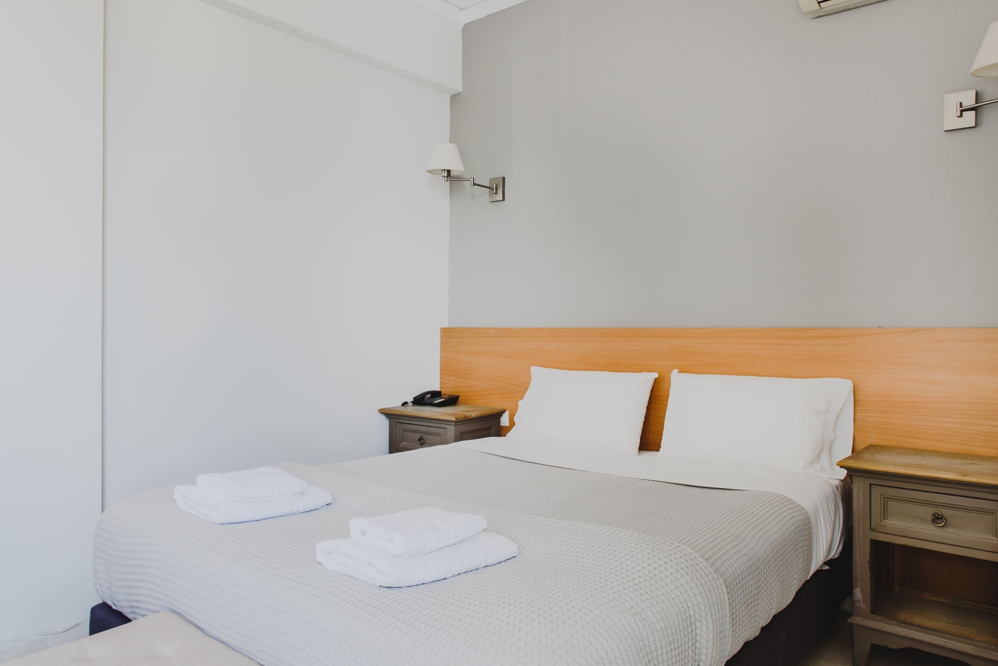 Δίκλινο δωμάτιο με λιτή διακόσμηση, πλήρως εξοπλισμένο με μεγάλο παράθυρο και θέα στο βουνό. Περιλαμβάνει διπλό κρεβάτι με ανατομικό στρώμα και όλες τις παροχές για μια άνετη και ξεκούραστη διαμονή.